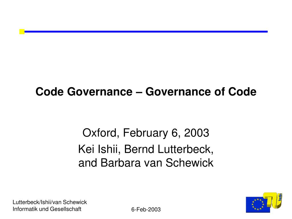 Code Governance – Governance of Code Oxford, February 6, 2003 Kei Ishii, Bernd Lutterbeck,and Barbara van Schewick Lutterbeck/Ishii/van SchewickInformatik und Gesellschaft