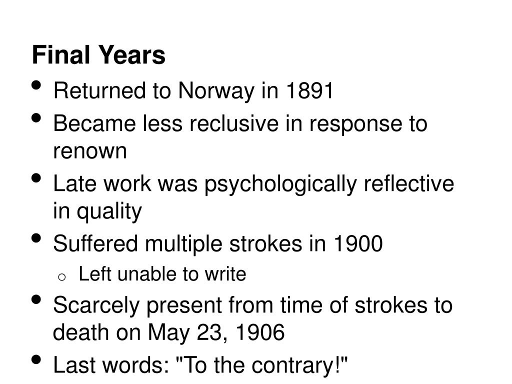 Final Years • Returned to Norway in 1891 • Became less reclusive in response to renown • Late work was psychologically reflective in quality • Suffered multiple strokes in 1900 • Left unable to write • Scarcely present from time of strokes to death on May 23, 1906 • Last words: "To the contrary!"