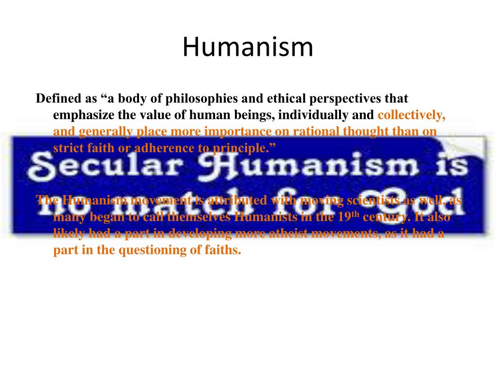 Humanism Defined as “a body of philosophies and ethical perspectives that emphasize the value of human beings, individually andcollectively, and generally place more importance on rational thought than on strict faith or adherence to principle.” The Humanism movement is attributed with moving scientists as well, as many began to call themselves Humanists in the 19th century. It also likely had a part in developing more atheist movements, as it had a part in the questioning of faiths.