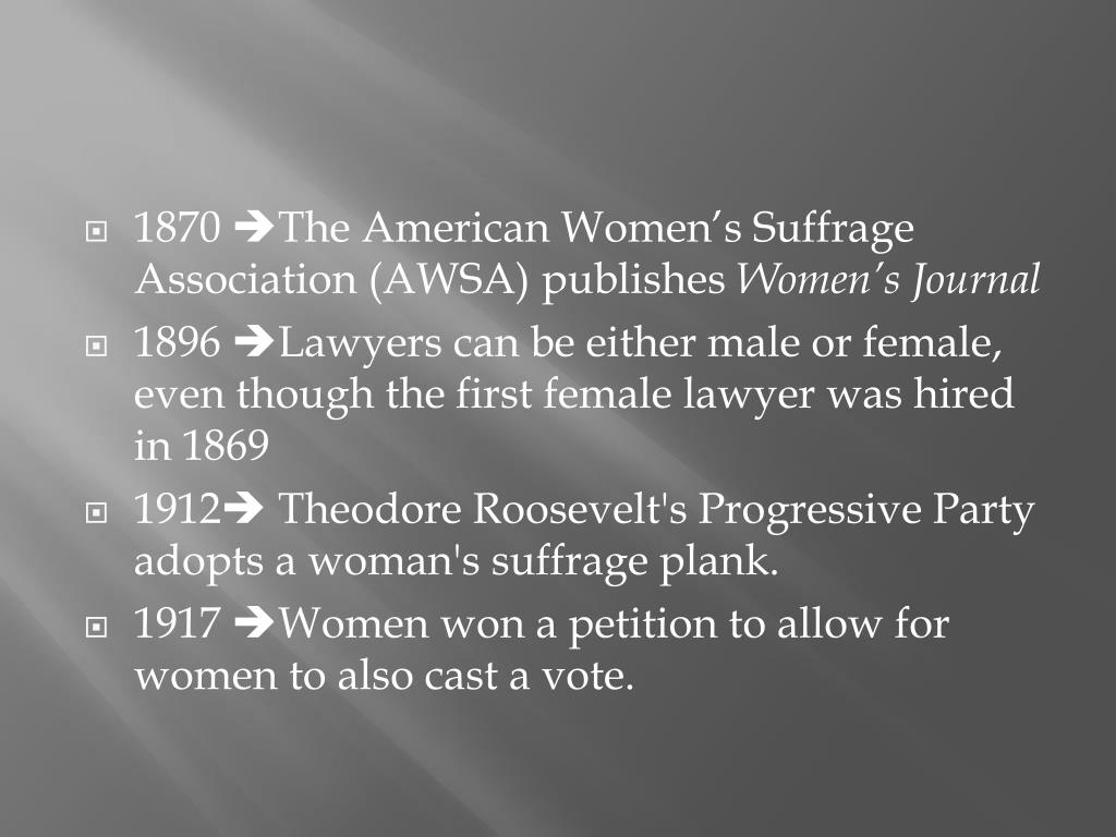 1870 The American Women’s Suffrage Association (AWSA) publishes Women’s Journal • 1896 Lawyers can be either male or female, even though the first female lawyer was hired in 1869 • 1912 Theodore Roosevelt's Progressive Party adopts a woman's suffrage plank. • 1917 Women won a petition to allow for women to also cast a vote.