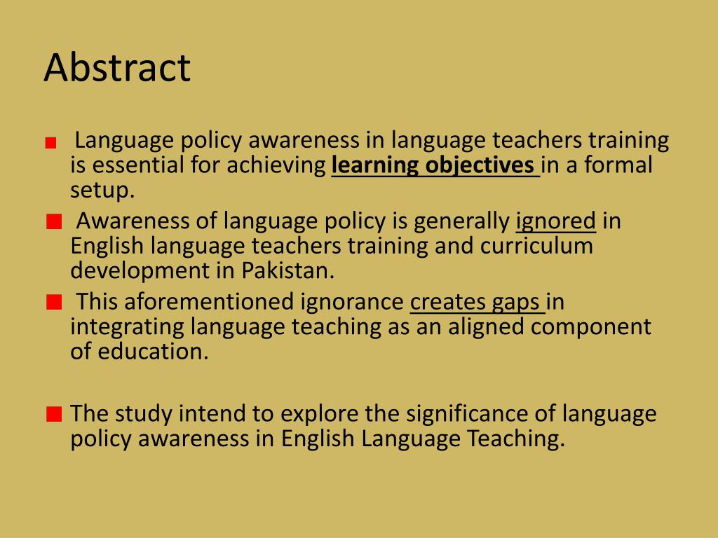 Abstract • Language policy awareness in language teachers training is essential for achieving learning objectives in a formal setup. • Awareness of language policy is generally ignored in English language teachers training and curriculum development in Pakistan. • This aforementioned ignorance creates gaps in integrating language teaching as an aligned component of education. • The study intend to explore the significance of language policy awareness in English Language Teaching.