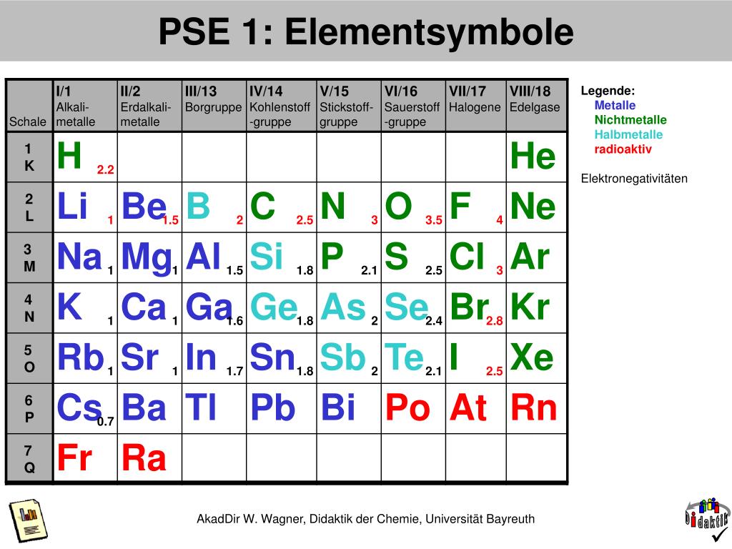 PSE 1: Elementsymbole Elektronegativitäten Metalle Nichtmetalle Halbmetalle radioaktiv Legende: AkadDir W. Wagner, Didaktik der Chemie, Universität Bayreuth
