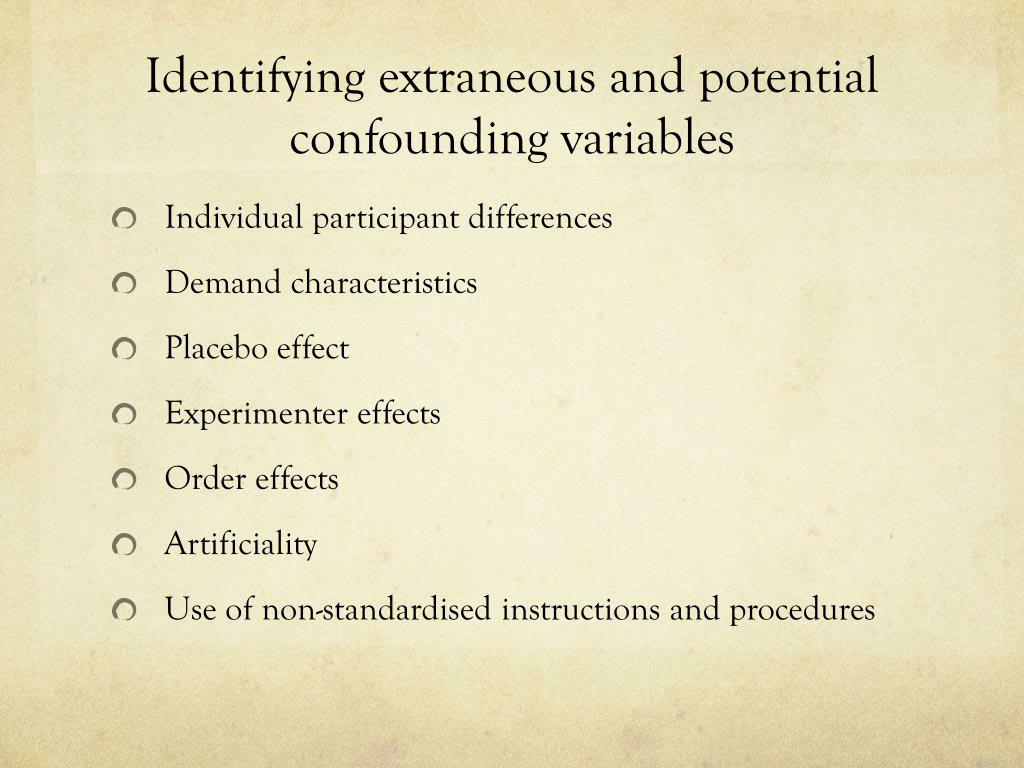 Identifying extraneous and potential confounding variables • Individual participant differences • Demand characteristics • Placebo effect • Experimenter effects • Order effects • Artificiality • Use of non-standardised instructions and procedures