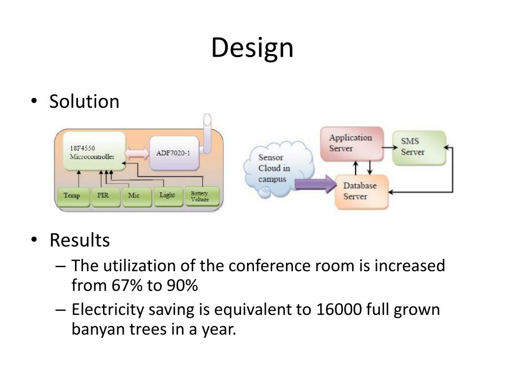 Design • Solution • Results • The utilization of the conference room is increased from 67% to 90% • Electricity saving is equivalent to 16000 full grown banyan trees in a year.
