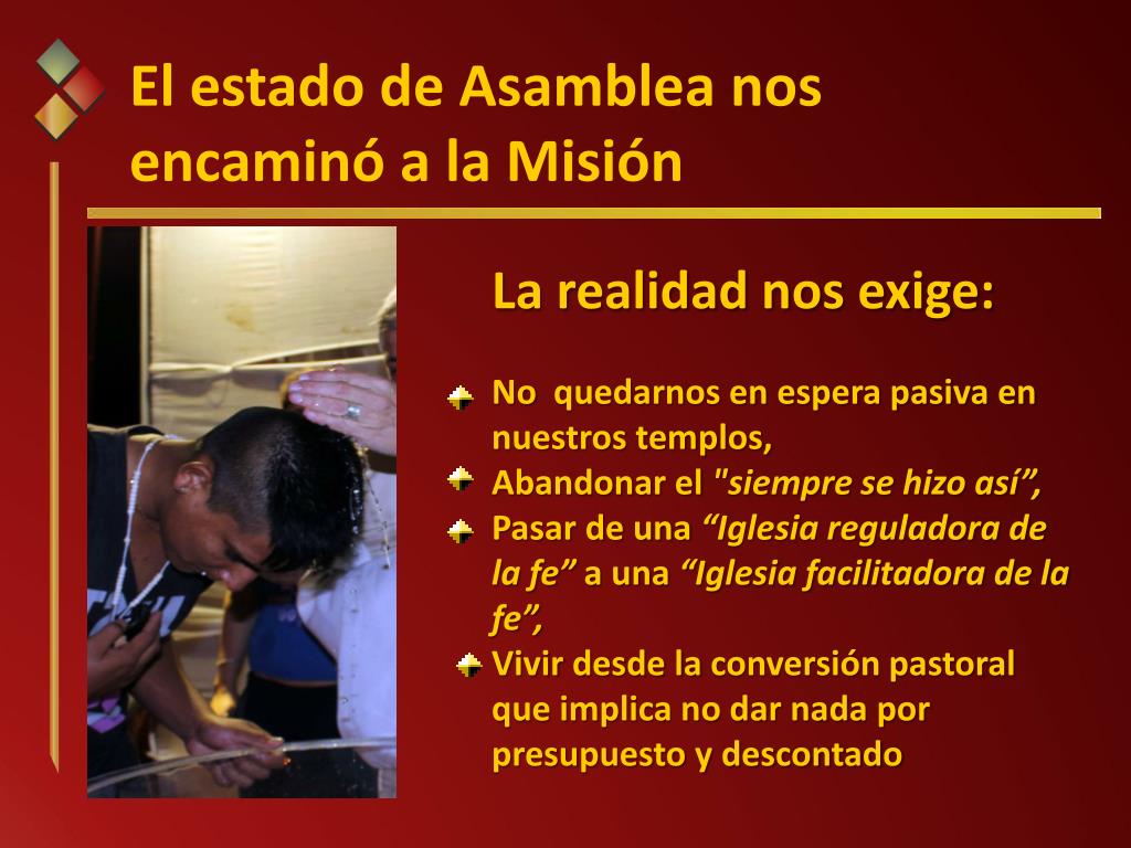 El estado de Asamblea nos encaminó a la Misión La realidad nos exige: No quedarnos en espera pasiva en nuestros templos, Abandonar el "siempre se hizo así”, Pasar de una “Iglesia reguladora de la fe” a una “Iglesia facilitadora de la fe”, Vivir desde la conversión pastoral que implica no dar nada por presupuesto y descontado