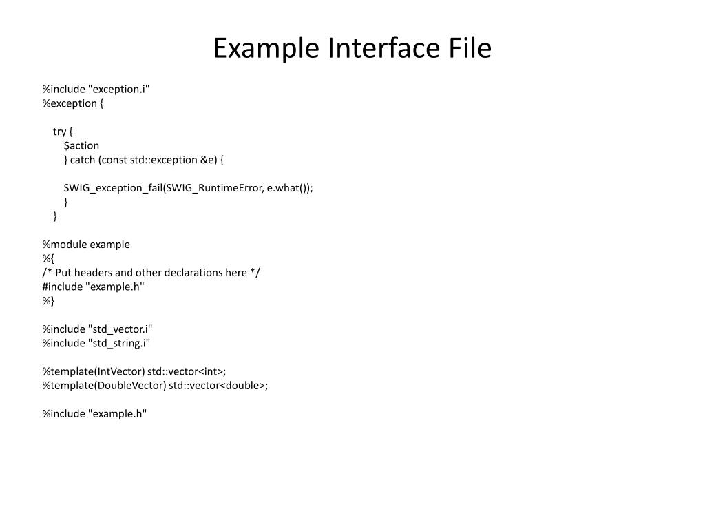Example Interface File %include "exception.i" %exception { try { $action } catch (const std::exception &e) { SWIG_exception_fail(SWIG_RuntimeError, e.what()); } } %module example %{ /* Put headers and other declarations here */ #include "example.h" %} %include "std_vector.i" %include "std_string.i" %template(IntVector) std::vector<int>; %template(DoubleVector) std::vector<double>; %include "example.h"