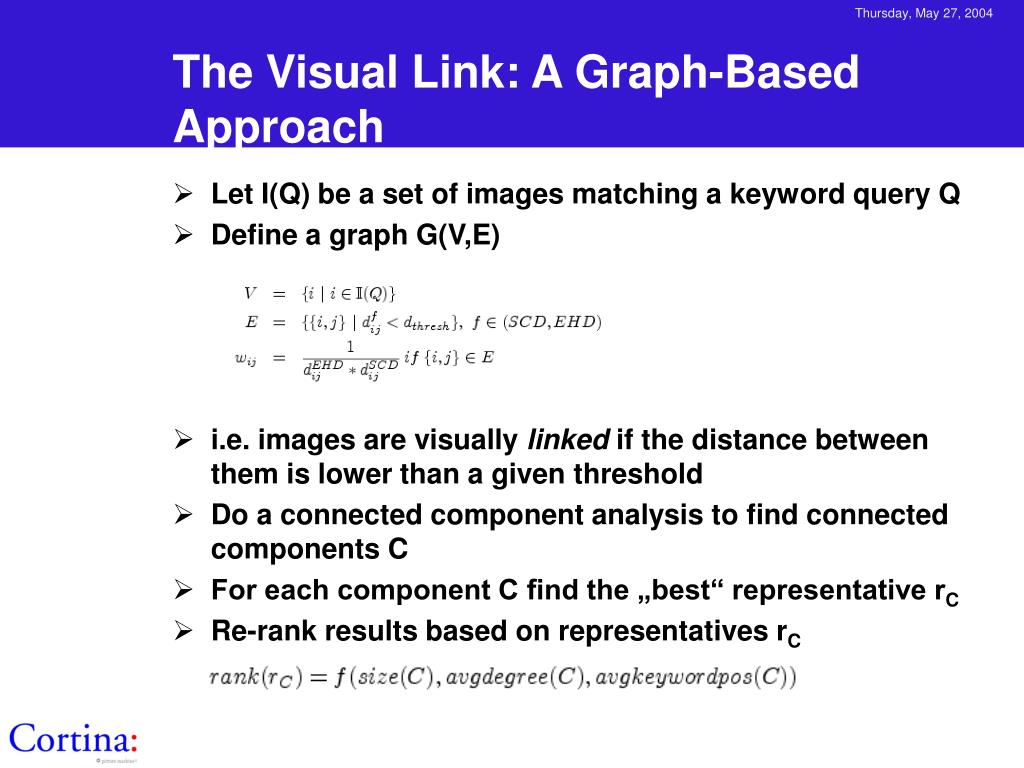 The Visual Link: A Graph-Based Approach • Let I(Q) be a set of images matching a keyword query Q • Define a graph G(V,E) • i.e. images are visually linked if the distance between them is lower than a given threshold • Do a connected component analysis to find connected components C • For each component C find the „best“ representative rC • Re-rank results based on representatives rC