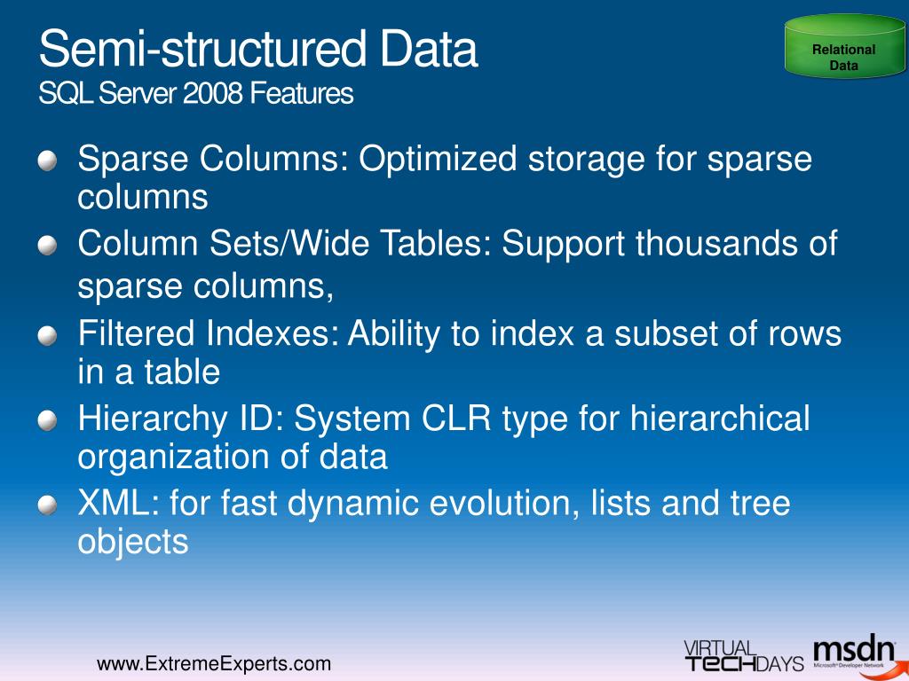 Beyond Relational: SQL Server 2008 Managing unstructured and semistructured Data Vinod Kumar Technology Evangelist | Microsoft www.ExtremeExperts.com http://blogs.sqlxml.org/vinodkumar