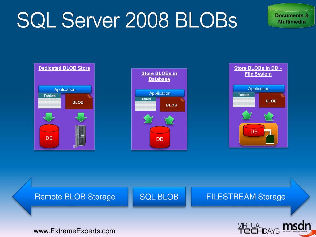 SQL Server 2008 BLOBs Documents & Multimedia Dedicated BLOB Store Store BLOBs in DB + File System Store BLOBs in Database Application Application Application BLOB BLOB BLOB DB DB DB FILESTREAM Storage Remote BLOB Storage SQL BLOB
