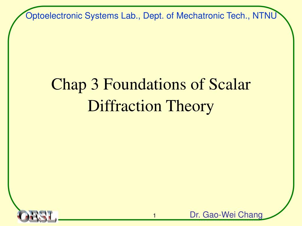 Chap 3 Foundations of Scalar Diffraction Theory. Content. 3.1 Historical introduction 3.2 From a vector to a scalar theory 3.3 Some mathematical preliminaries 3.4 The Kirchhoff formulation of diffraction by a planar screen
