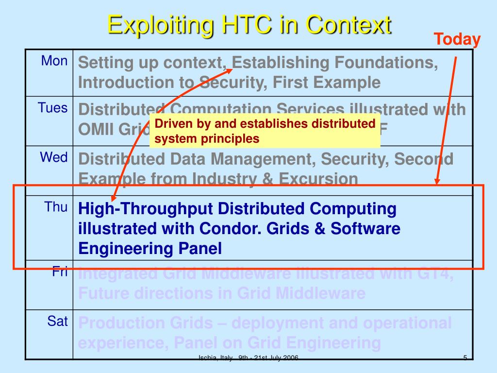 Today Driven by and establishes distributed system principles Exploiting HTC in Context Ischia, Italy 9th - 21st July 2006