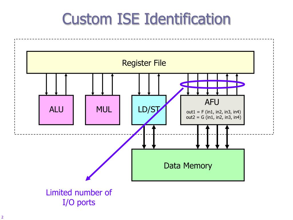 Custom ISE Identification Register File AFU ALU MUL LD/ST out1 = F (in1, in2, in3, in4) out2 = G (in1, in2, in3, in4) Data Memory Limited number of I/O ports