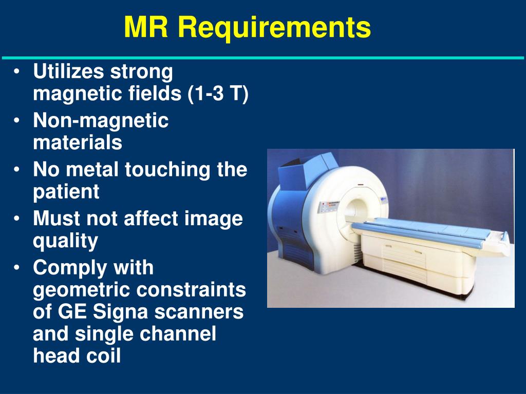 MR Requirements • Utilizes strong magnetic fields (1-3 T) • Non-magnetic materials • No metal touching the patient • Must not affect image quality • Comply with geometric constraints of GE Signa scanners and single channel head coil