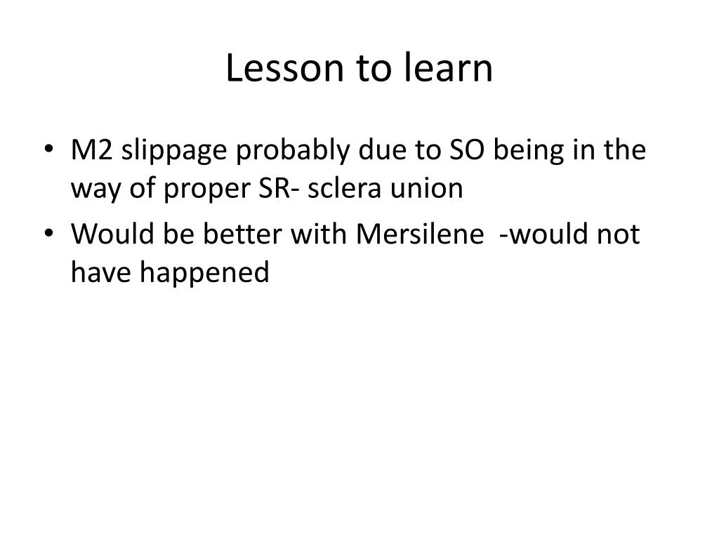 Lesson to learn • M2 slippage probably due to SO being in the way of proper SR- sclera union • Would be better with Mersilene -would not have happened
