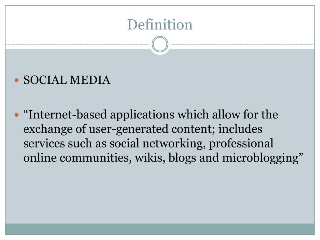 Definition SOCIAL MEDIA “Internet-based applications which allow for the exchange of user-generated content; includes services such as social networking, professional online communities, wikis, blogs and microblogging”