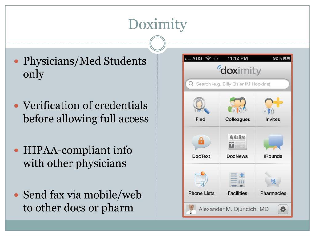 Doximity Physicians/Med Students only Verification of credentials before allowing full access HIPAA-compliant info with other physicians Send fax via mobile/web to other docs or pharm