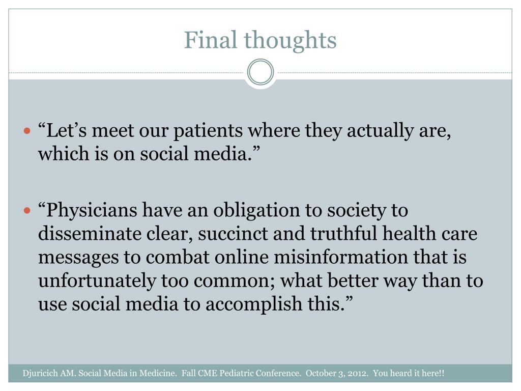 Final thoughts “Let’s meet our patients where they actually are, which is on social media.” “Physicians have an obligation to society to disseminate clear, succinct and truthful health care messages to combat online misinformation that is unfortunately too common; what better way than to use social media to accomplish this.” Djuricich AM. Social Media in Medicine. Fall CME Pediatric Conference. October 3, 2012. You heard it here!!