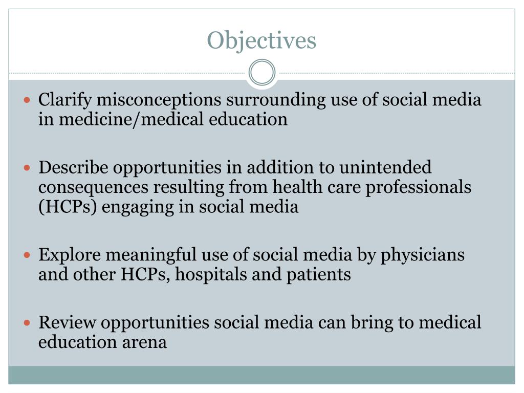 Objectives Clarify misconceptions surrounding use of social media in medicine/medical education Describe opportunities in addition to unintended consequences resulting from health care professionals (HCPs) engaging in social media Explore meaningful use of social media by physicians and other HCPs, hospitals and patients Review opportunities social media can bring to medical education arena