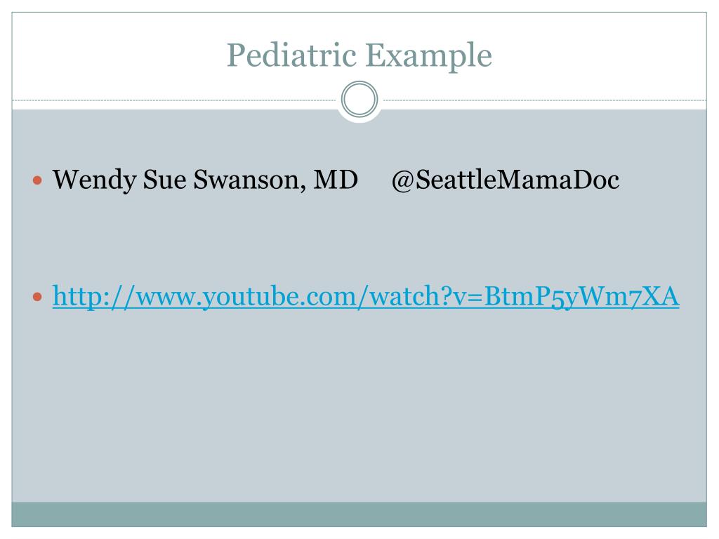 Pediatric Example Wendy Sue Swanson, MD @SeattleMamaDoc http://www.youtube.com/watch?v=BtmP5yWm7XA