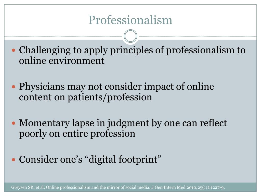 Professionalism – The Positive “We must go farther than curtailing unprofessional behavior online and embrace the positive potential for social media: physicians and health care organizations can and should utilize the power of social media to facilitate interactions with patients and the public that increase their confidence in the medical profession.” Greysen SR, et al. Online professionalism and the mirror of social media. J Gen Intern Med 2010;25(11):1227-9.