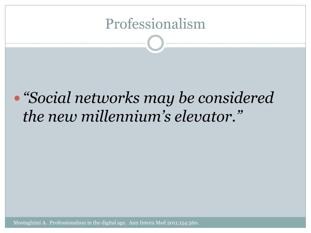 Professionalism “Social networks may be considered the new millennium’s elevator.” Mostaghimi A. Professionalism in the digital age. Ann Intern Med 2011;154:560.