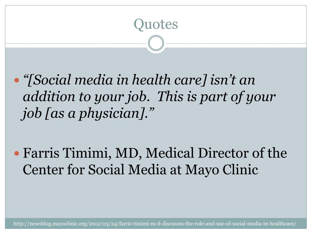 Quotes “[Social media in health care] isn’t an addition to your job. This is part of your job [as a physician].” Farris Timimi, MD, Medical Director of the Center for Social Media at Mayo Clinic http://newsblog.mayoclinic.org/2012/03/24/farris-timimi-m-d-discusses-the-role-and-use-of-social-media-in-healthcare/