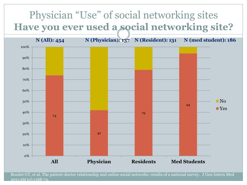 Physician “Use” of social networking sitesHave you ever used a social networking site?N (All): 454 N (Physician): 137 N (Resident): 131 N (med student): 186 Bosslet GT, et al. The patient-doctor relationship and online social networks: results of a national survey. J Gen Intern Med 2011;26(10):1168-74.