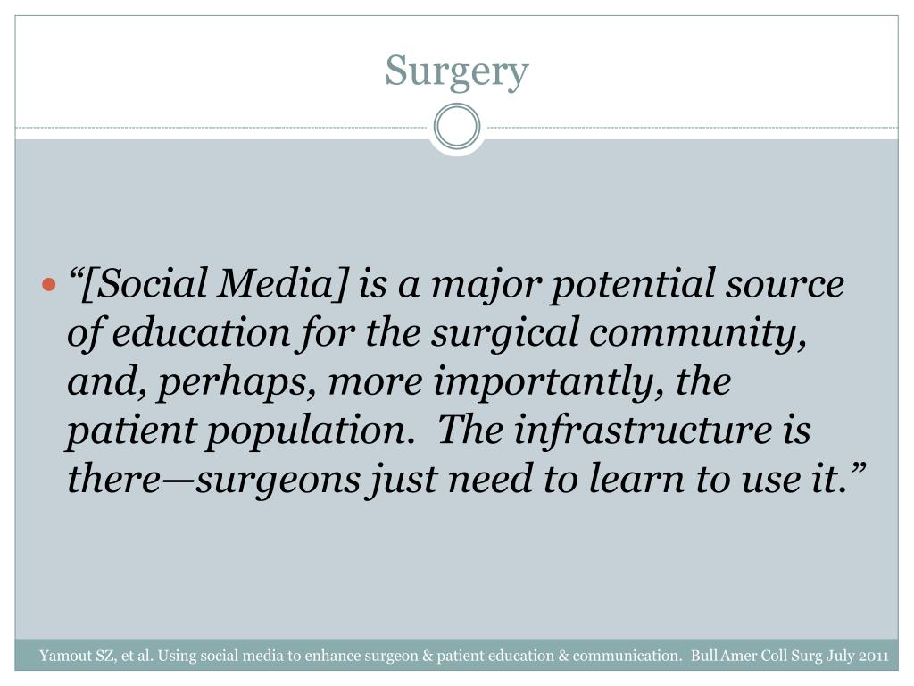 Surgery “[Social Media] is a major potential source of education for the surgical community, and, perhaps, more importantly, the patient population. The infrastructure is there—surgeons just need to learn to use it.” Yamout SZ, et al. Using social media to enhance surgeon & patient education & communication. Bull AmerCollSurg July 2011