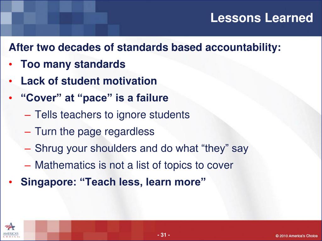 Lessons Learned After two decades of standards based accountability: • Too many standards • Lack of student motivation • “Cover” at “pace” is a failure • Tells teachers to ignore students • Turn the page regardless • Shrug your shoulders and do what “they” say • Mathematics is not a list of topics to cover • Singapore: “Teach less, learn more”