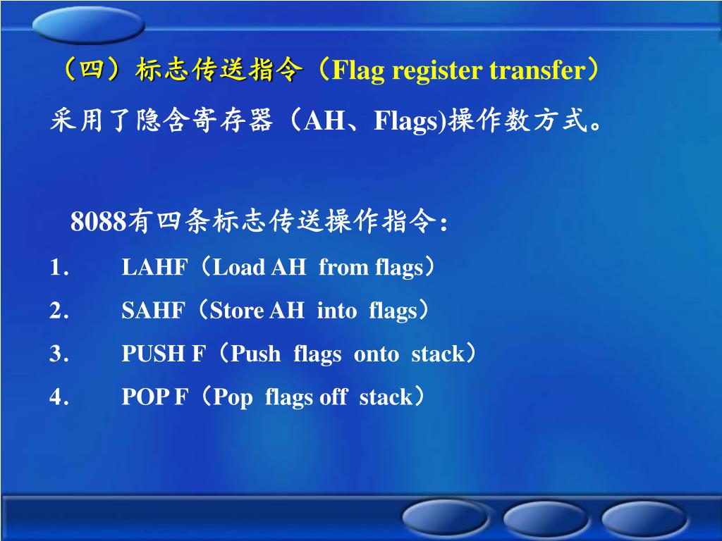 (四)标志传送指令(Flag register transfer) 采用了隐含寄存器(AH、Flags)操作数方式。 8088有四条标志传送操作指令: 1. LAHF(Load AH from flags) 2. SAHF(Store AH into flags) 3. PUSH F(Push flags onto stack) 4. POP F(Pop flags off stack)