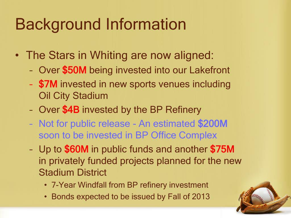 Background Information • The Stars in Whiting are now aligned: • Over $50M being invested into our Lakefront • $7M invested in new sports venues including Oil City Stadium • Over $4B invested by the BP Refinery • Not for public release - An estimated $200M soon to be invested in BP Office Complex • Up to $60M in public funds and another $75M in privately funded projects planned for the new Stadium District • 7-Year Windfall from BP refinery investment • Bonds expected to be issued by Fall of 2013