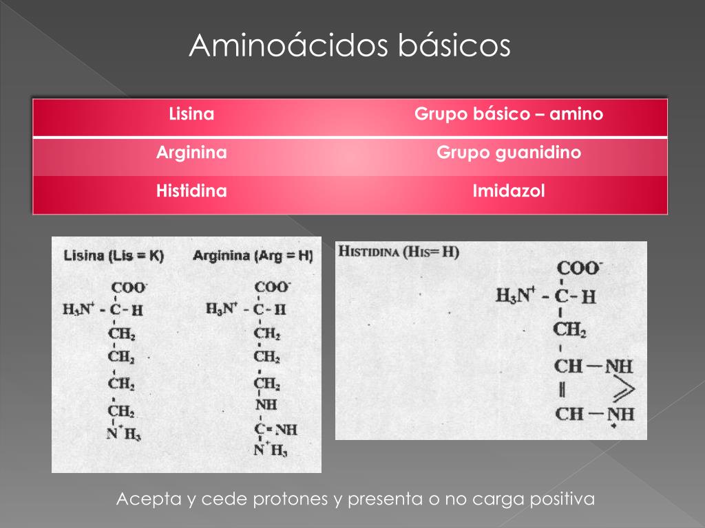 Aminoácidos básicos Acepta y cede protones y presenta o no carga positiva