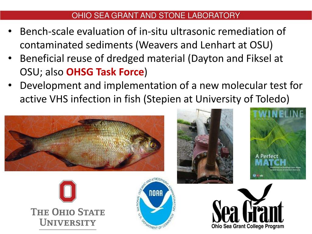 OHIO SEA GRANT AND STONE LABORATORY • Bench-scale evaluation of in-situ ultrasonic remediation of contaminated sediments (Weavers and Lenhart at OSU) • Beneficial reuse of dredged material (Dayton and Fiksel at OSU; also OHSG Task Force) • Development and implementation of a new molecular test for active VHS infection in fish (Stepien at University of Toledo)