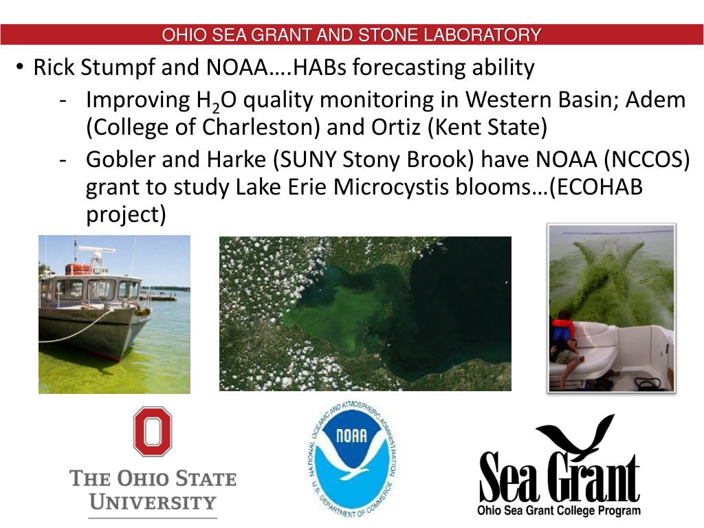 OHIO SEA GRANT AND STONE LABORATORY • Rick Stumpf and NOAA….HABs forecasting ability • Improving H2O quality monitoring in Western Basin; Adem (College of Charleston) and Ortiz (Kent State) • Goblerand Harke (SUNY Stony Brook) have NOAA (NCCOS) grant to study Lake Erie Microcystisblooms…(ECOHABproject)