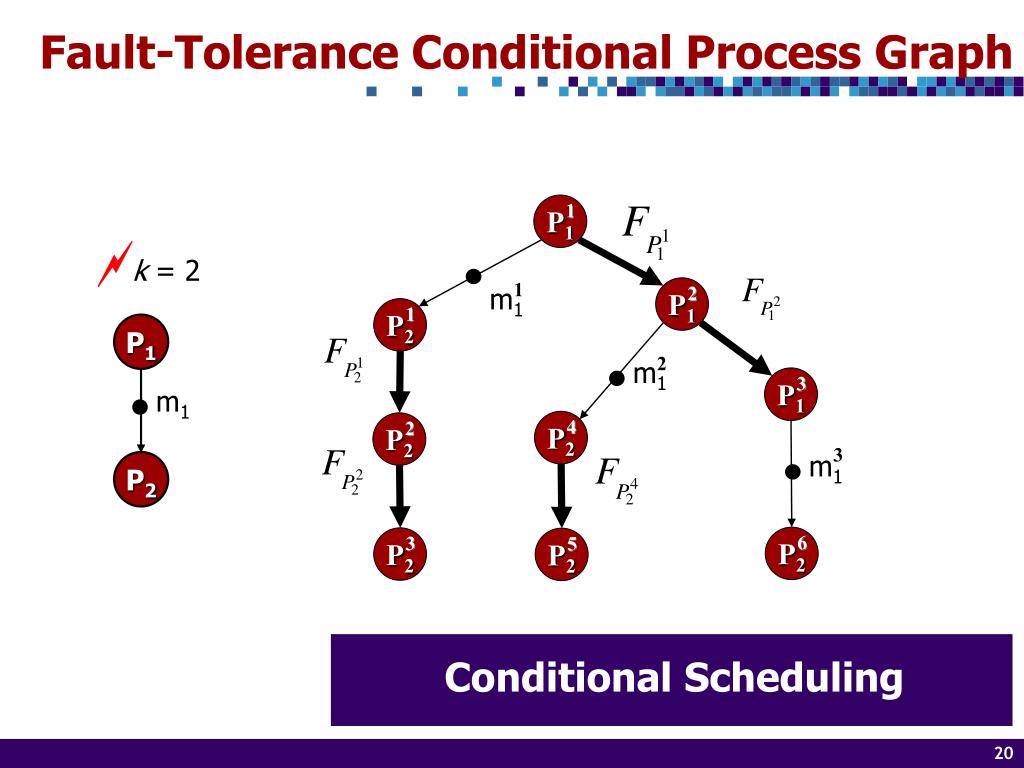 k = 2 Conditional Scheduling Fault-Tolerance Conditional Process Graph P1 1 m1 1 P1 2 P2 1 P1 m1 2 P1 3 m1 P2 P2 4 2 m1 3 P2 P2 P2 P2 6 3 5