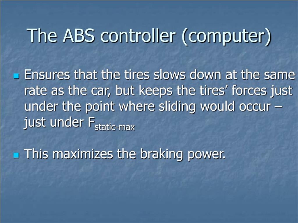 The ABS controller (computer) • Ensures that the tires slows down at the same rate as the car, but keeps the tires’ forces just under the point where sliding would occur – just under Fstatic-max • This maximizes the braking power.