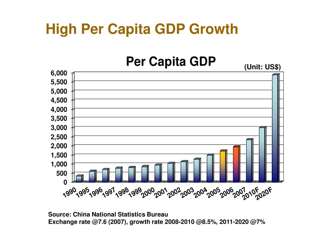 High Per Capita GDP Growth (Unit: US$) Source: China National Statistics Bureau Exchange rate @7.6 (2007), growth rate 2008-2010 @8.5%, 2011-2020 @7%