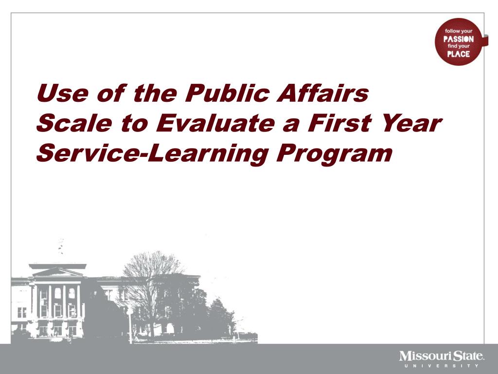 Public Affairs Mission at Missouri State • In 2007-2008 – At the beginning of the Public Affairs Scale Development • Re-definition and Focus of the Mission • Search for an Associate Provost for Student Development and Public Affairs • Operationalization of the public affairs mission at the department and college level unit of analysis