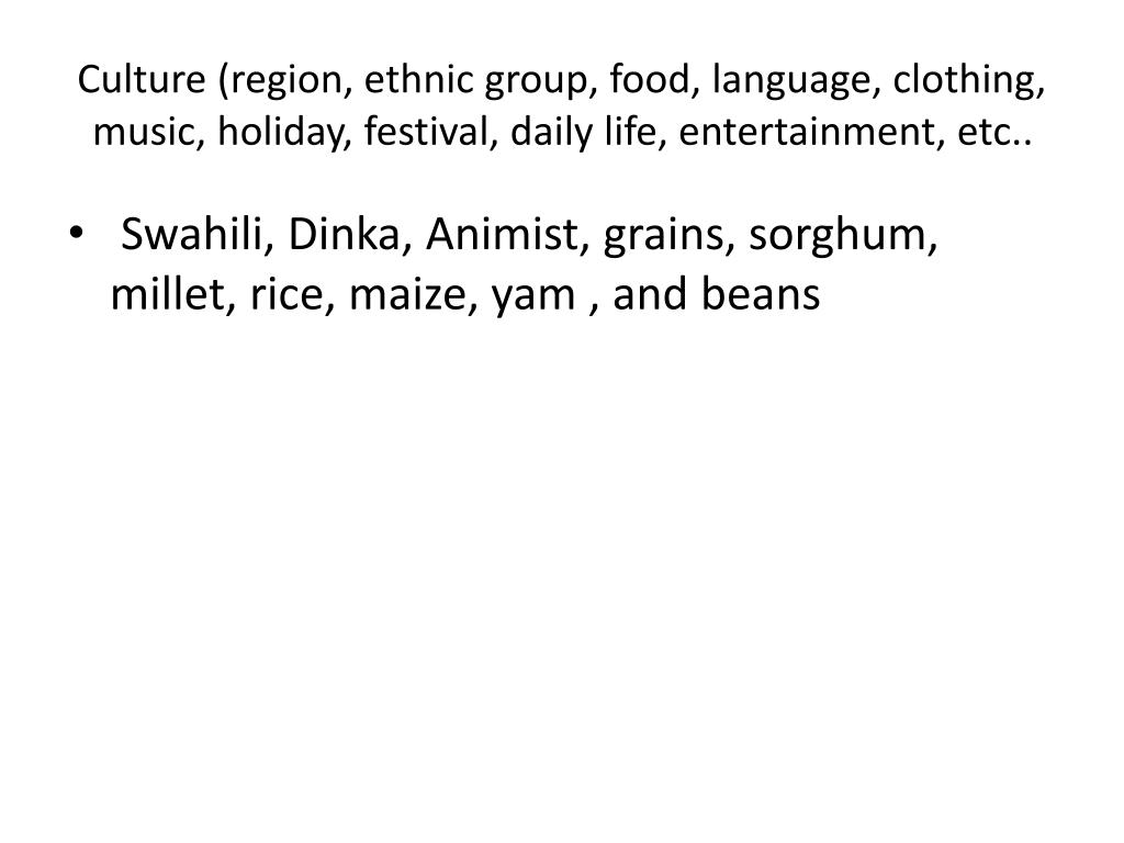 Culture (region, ethnic group, food, language, clothing, music, holiday, festival, daily life, entertainment, etc.. • Swahili, Dinka, Animist, grains, sorghum, millet, rice, maize, yam , and beans
