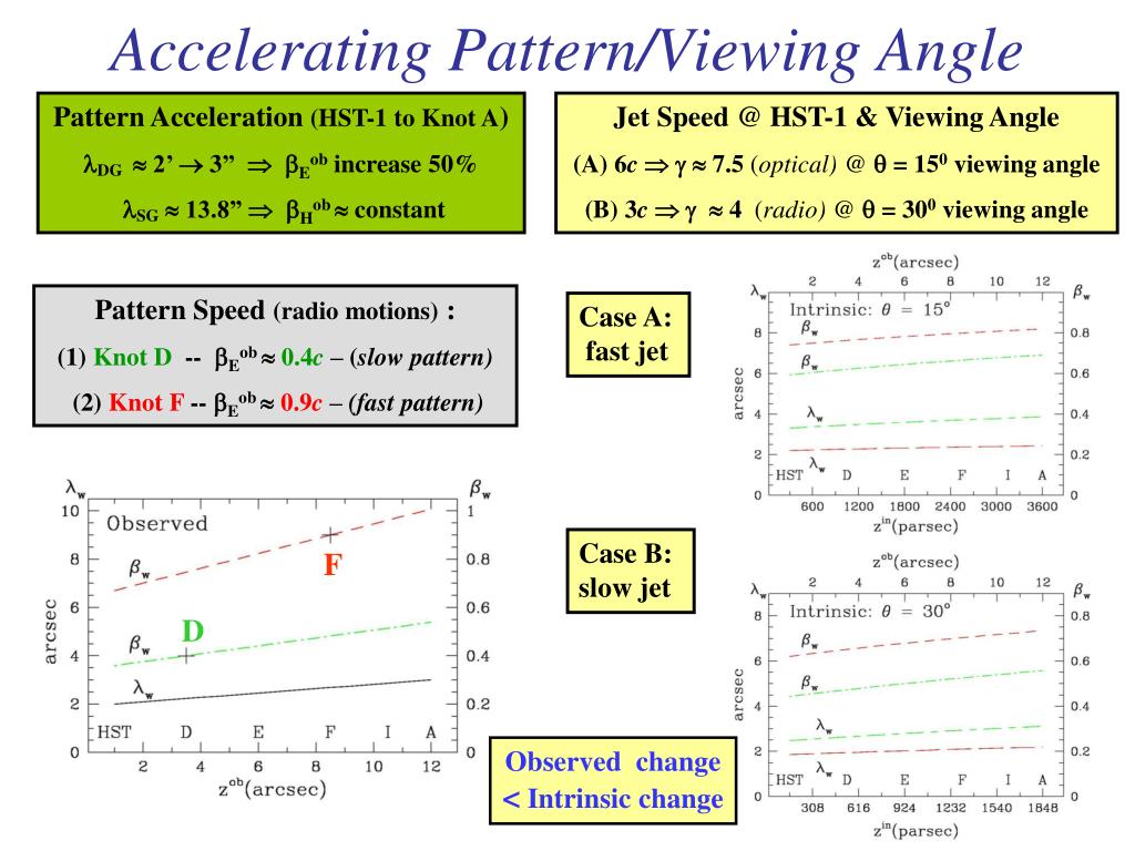 Accelerating Pattern/Viewing Angle Pattern Acceleration (HST-1 to Knot A) lDG 2’ 3”Eob increase 50% lSG 13.8”Hob constant Jet Speed @ HST-1 & Viewing Angle (A)6c 7.5 (optical) @ = 150 viewing angle (B)3c 4 (radio) @ = 300 viewing angle Pattern Speed (radio motions) : (1) Knot D-- Eob 0.4c– (slow pattern) (2)Knot F --Eob 0.9c– (fast pattern) Case A: fast jet Case B: slow jet F D Observed change < Intrinsic change