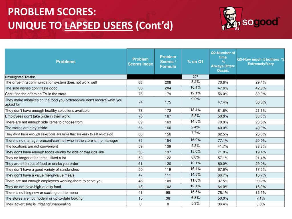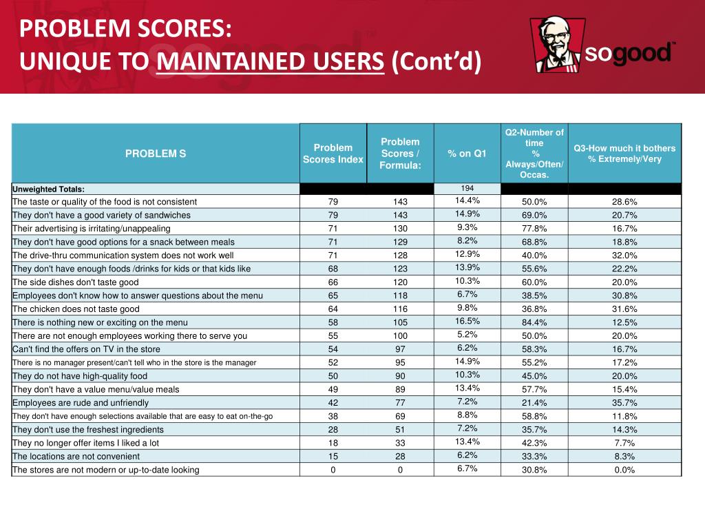 TOP PROBLEMS: PRIORITY PROBLEMS: Among Total Customers SECONDARY PROBLEMS: Among Lapsed Customers TERTIARY PROBLEMS: Among Maint’dCustomers • Food too expensive to buy for myself • Prices too high • Food to expensive to buy for group or family • Portion sizes too small. • Don’t have enough healthy selections available. • Chicken too greasy. • Mistakes made with order/delivery of order. • Taste or quality not consistent. • Food too fattening. • Lines too long to wait on. • Food too expensive to buy for myself. • Taste or quality not consistent. • Food too fattening. • Portion sized too small. • Food too expensive for group or family. • Prices too high. • Chicken too greasy. • Don’t offer special deals /discounts often. • Don’t have enough healthy selections. • No manager present or visible on site. • Lines too long to wait on. • Don’t have beverage variety I want. • Not enough side items/dishes. Prices too high. Food to expensive for me to buy for myself. Mistakes are made with order/delivery of order. Portion size is too small. Don’t have enough healthy selections. Food is fattening. Don’t have beverage variety I want. Food too expensive for group or family. Chicken too greasy. Don’t offer specials /discounts very often. Unique as top problem for that segment
