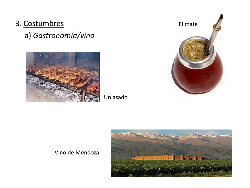 El mate 3. Costumbres a) Gastronomía/vino Un asado Vino de Mendoza
