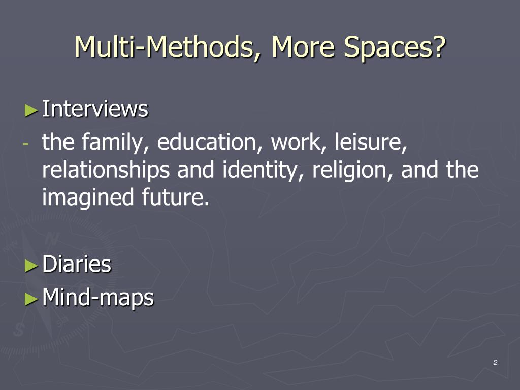 Multi-Methods, More Spaces? • Interviews • the family, education, work, leisure, relationships and identity, religion, and the imagined future. • Diaries • Mind-maps