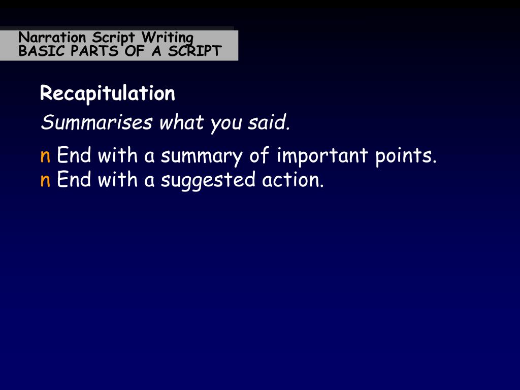 Narration Script Writing BASIC PARTS OF A SCRIPT n End with a summary of important points. n End with a suggested action. Recapitulation Summarises what you said.