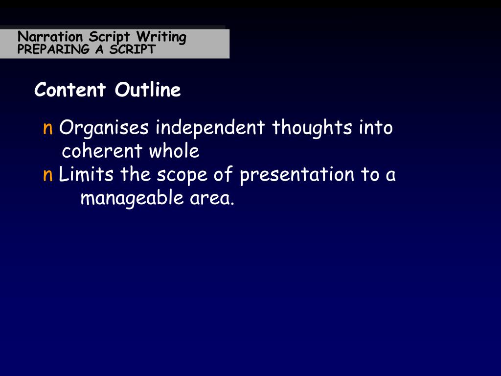 n Organises independent thoughts into coherent whole n Limits the scope of presentation to a manageable area. Narration Script Writing PREPARING A SCRIPT Content Outline