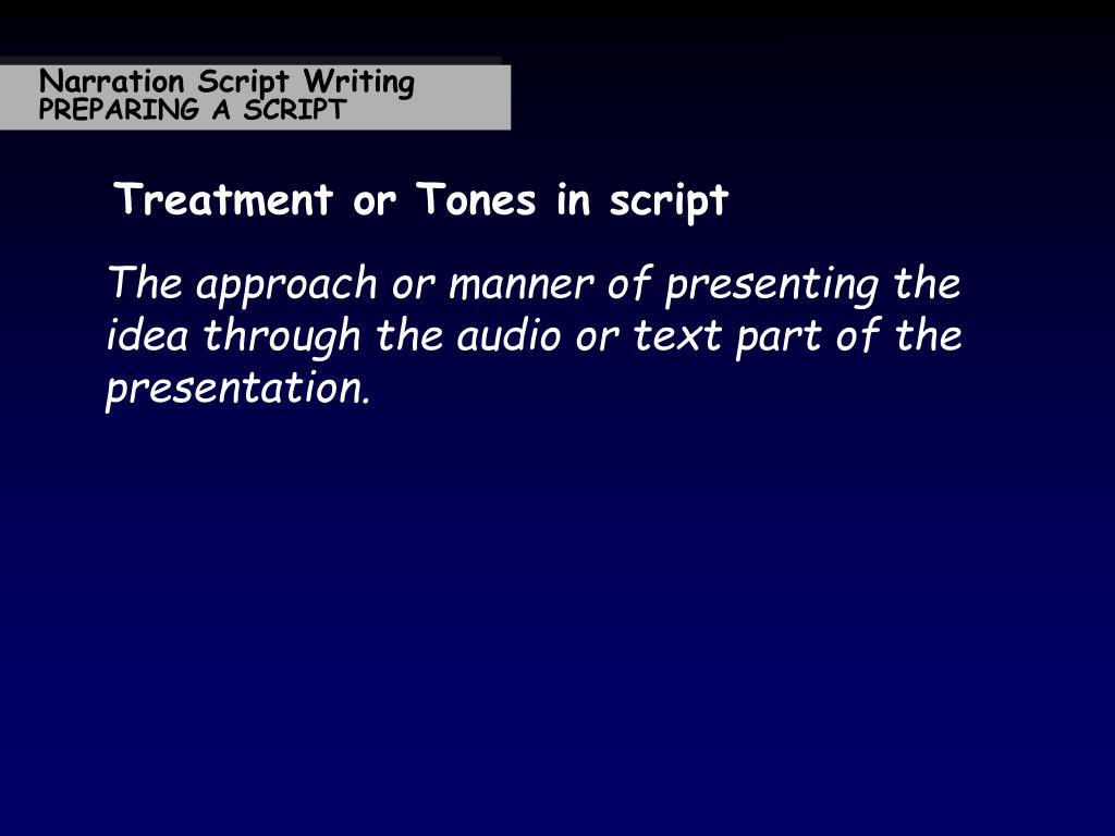 The approach or manner of presenting the idea through the audio or text part of the presentation. Narration Script Writing PREPARING A SCRIPT Treatment or Tones in script