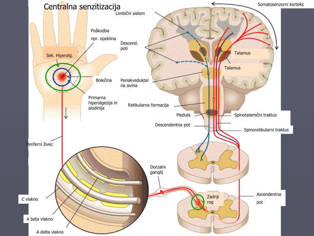 Centralna senzitizacija Somatosenzorni korteks Limbični sistem Poškodba npr. opeklina Descend. poti Talamus Sek. Hiperalg. Talamus Bolečina Periakveduktalna sivina Primarna hiperalgezija in alodinija Retikularna formacija Medula Spinotalamični traktus Descendentna pot Spinoretikularni traktus Periferni živec Dorzalni ganglij Ascendentna pot Zadnji rog C vlakno A beta vlakno A delta vlakno