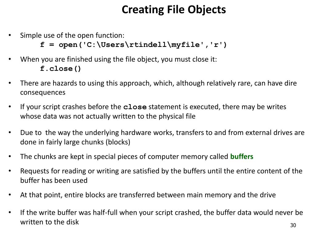 Creating File Objects • Simple use of the open function:f = open('C:\Users\rtindell\myfile','r') • When you are finished using the file object, you must close it:f.close() • There are hazards to using this approach, which, although relatively rare, can have dire consequences • If your script crashes before the close statement is executed, there may be writes whose data was not actually written to the physical file • Due to the way the underlying hardware works, transfers to and from external drives are done in fairly large chunks (blocks) • The chunks are kept in special pieces of computer memory called buffers • Requests for reading or writing are satisfied by the buffers until the entire content of the buffer has been used • At that point, entire blocks are transferred between main memory and the drive • If the write buffer was half-full when your script crashed, the buffer data would never be written to the disk
