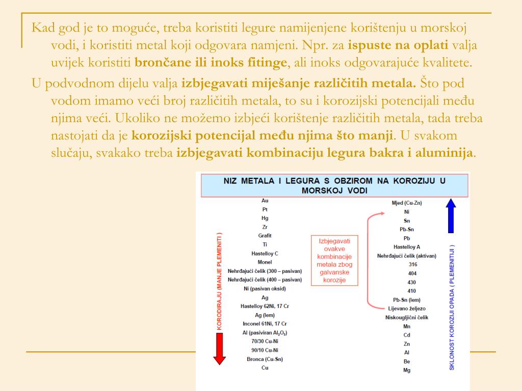 Kad god je to moguće, trebakoristiti legure namijenjene korištenjuu morskoj vodi, i koristiti metal kojiodgovara namjeni. Npr. za ispuste na oplati valja uvijek koristiti brončane ili inoks fitinge, ali inoks odgovarajućekvalitete. U podvodnom dijelu valja izbjegavati miješanje različitih metala. Što pod vodom imamo veći brojrazličitih metala, to su i korozijski potencijali među njima veći. Ukoliko ne možemo izbjeći korištenje različitih metala, tada treba nastojati da je korozijski potencijal među njima što manji. U svakom slučaju, svakako treba izbjegavati kombinaciju legura bakra i aluminija.