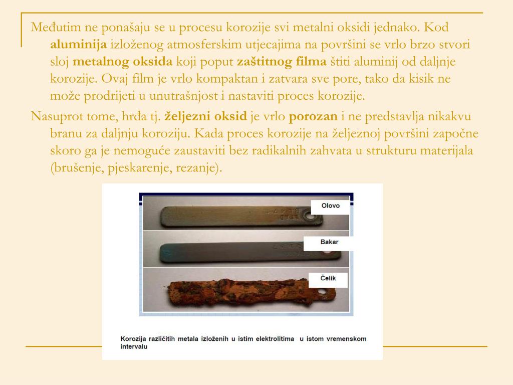 Međutim ne ponašaju se u procesu korozije svi metalni oksidi jednako. Kod aluminija izloženog atmosferskim utjecajima na površini se vrlo brzo stvori sloj metalnog oksida koji poput zaštitnog filma štiti aluminij od daljnje korozije. Ovaj film je vrlo kompaktan i zatvara sve pore, tako da kisik ne može prodrijeti u unutrašnjost i nastaviti proces korozije. Nasuprot tome, hrđa tj. željezni oksid je vrlo porozan i ne predstavlja nikakvu branu za daljnju koroziju. Kada proces korozije na željeznoj površini započne skoro ga je nemoguće zaustaviti bez radikalnih zahvata u strukturu materijala (brušenje, pjeskarenje, rezanje).